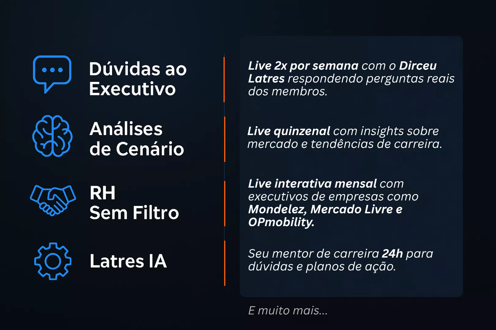 Na Comunidade, você tem acesso direto a Dirceu Latres — executivo com mais de 30 anos em RH em empresas como ADP, Accenture e Mondelez — e a líderes de grandes organizações e Executivos Convidados que compartilham o que realmente faz diferença nas decisões de promoção e contratação além de atualizar sobre o mercado.
